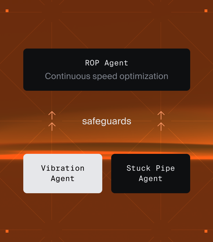 The ROP Agent optimizes drilling speed. The Vibration and Stuck Pipe Agents safeguard it — so faster never means riskier.